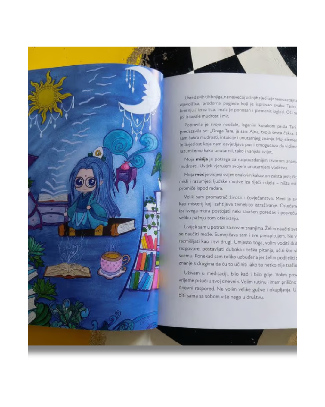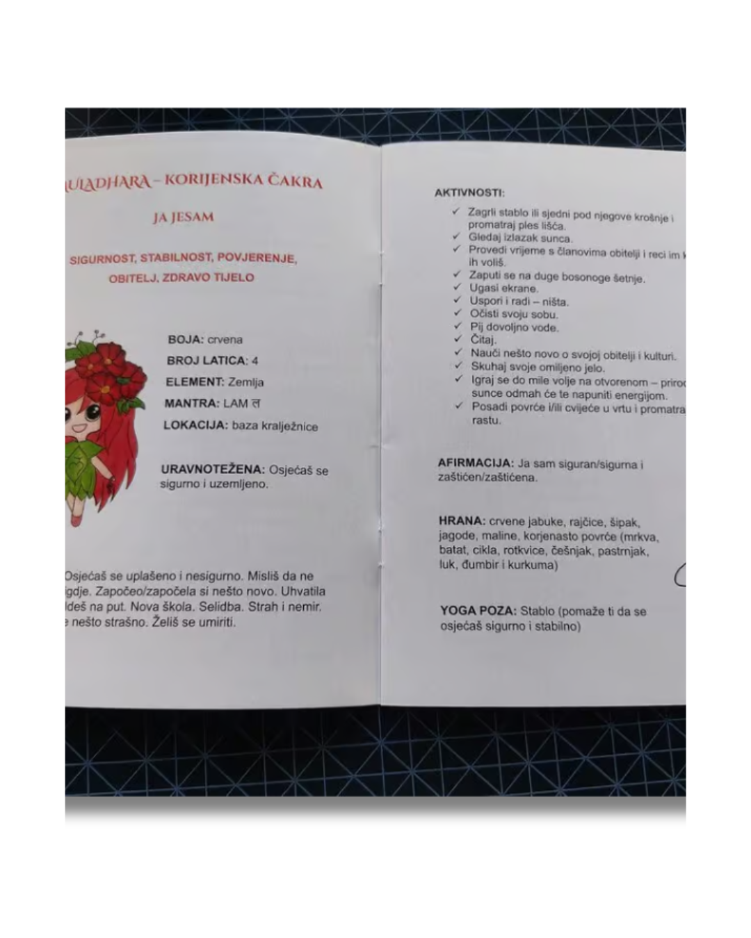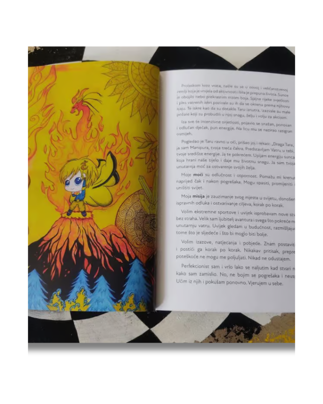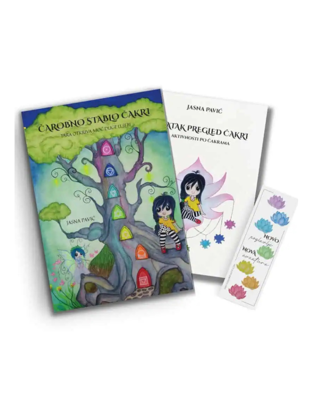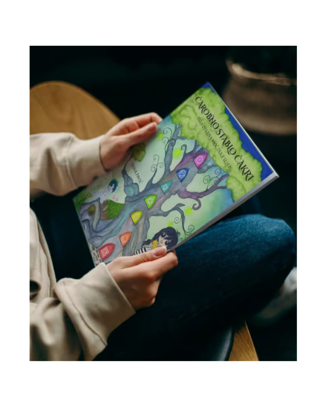 Tara otkriva čarobno stablo koje čuva tajne sedam čakri – naših unutarnjih energetskih centara – od uzemljujuće energije korijenske čakre do mudrosti krunske čakre. Stablo u svom deblu skriva sedam vrata i svaka nose svoju boju, simbol i životinjskog vodiča. Crvena vode u snagu korijena, narančasta u kreativnost i osjećaje, žuta u samopouzdanje, zelena u ljubav… Ova slikovnica nije samo priča, već i vodič kroz naše unutarnje svjetove. Pomaže djeci prepoznati što se događa u njima kad su tužni, ljuti ili sretni, i otkriti da su sve emocije u redu – samo ih treba čuti. Roditeljima nudi most prema dubljem razumijevanju djetetovih i vlastitih osjećaja, otvarajući prostor za bliskost, razgovor i zajedničko učenje.Zamišljena je kao prvi korak u podršci djeci, mladima i odraslima na putu osobnog i duhovnog rasta, samootkrivanja i povezanosti sa svojim unutarnjim bićem.Istodobno je dragocjen alat za sve koji se bave osobnim razvojem, yogom ili svjesnim roditeljstvom – jer uči kako se vratiti sebi, kroz igru i nježnost. Uz slikovnicu dolazi knjižica s kratkim pregledom svake čakre te meditacijom u pisanom i audioobliku koja vam pomaže da se kroz razne aktivnosti i u stvarnom svijetu povežete sa svojim čakrama i iskoristite svoju jedinstvenu energiju! Na poklon dobivate i odgovarajući bookmark.- Nakladnik: Santosha Kreativ