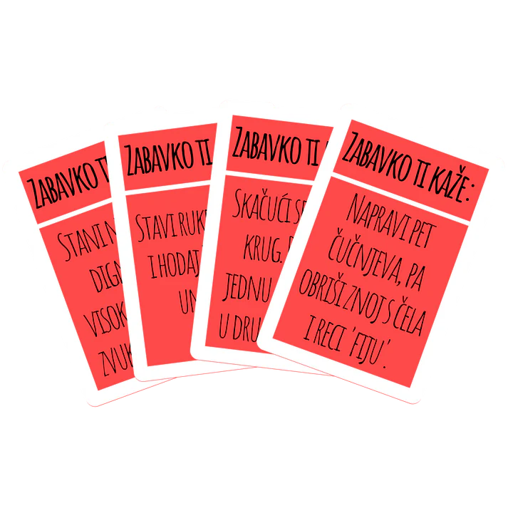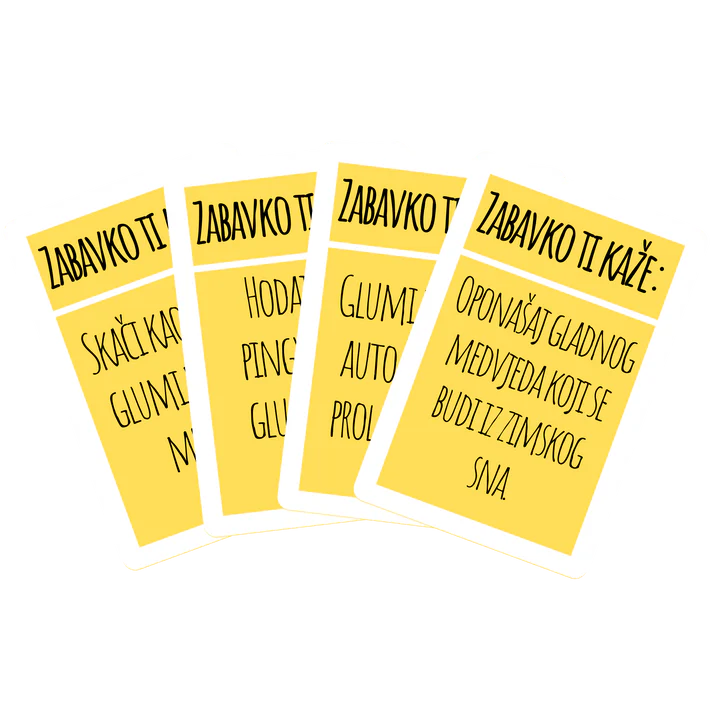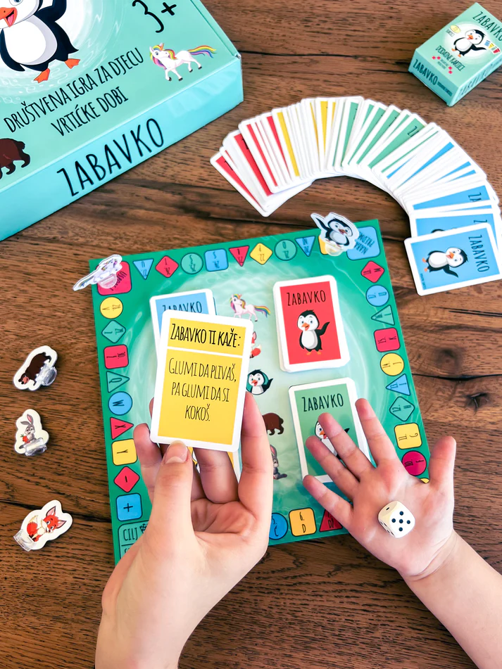 ZABAVKO je vesela i dinamična društvena igra namijenjena za djecu vrtićke dobi. Kroz različite kategorije izazova, ZABAVKO potiče razvoj ključnih vještina poput govorne komunikacije, logičkog razmišljanja, koordinacije pokreta i maštovitog izražavanja.