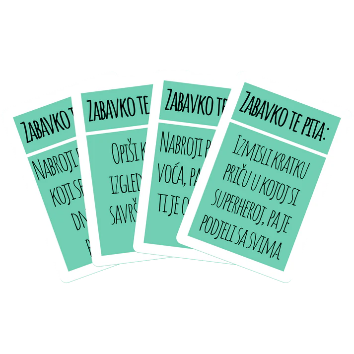 - 72 x Kartice (18 kartica aktivnosti, 18 kartica glume i oponašanja, 18 kartica nabrajanja i opisivanja, 18 kartica zagonetki)